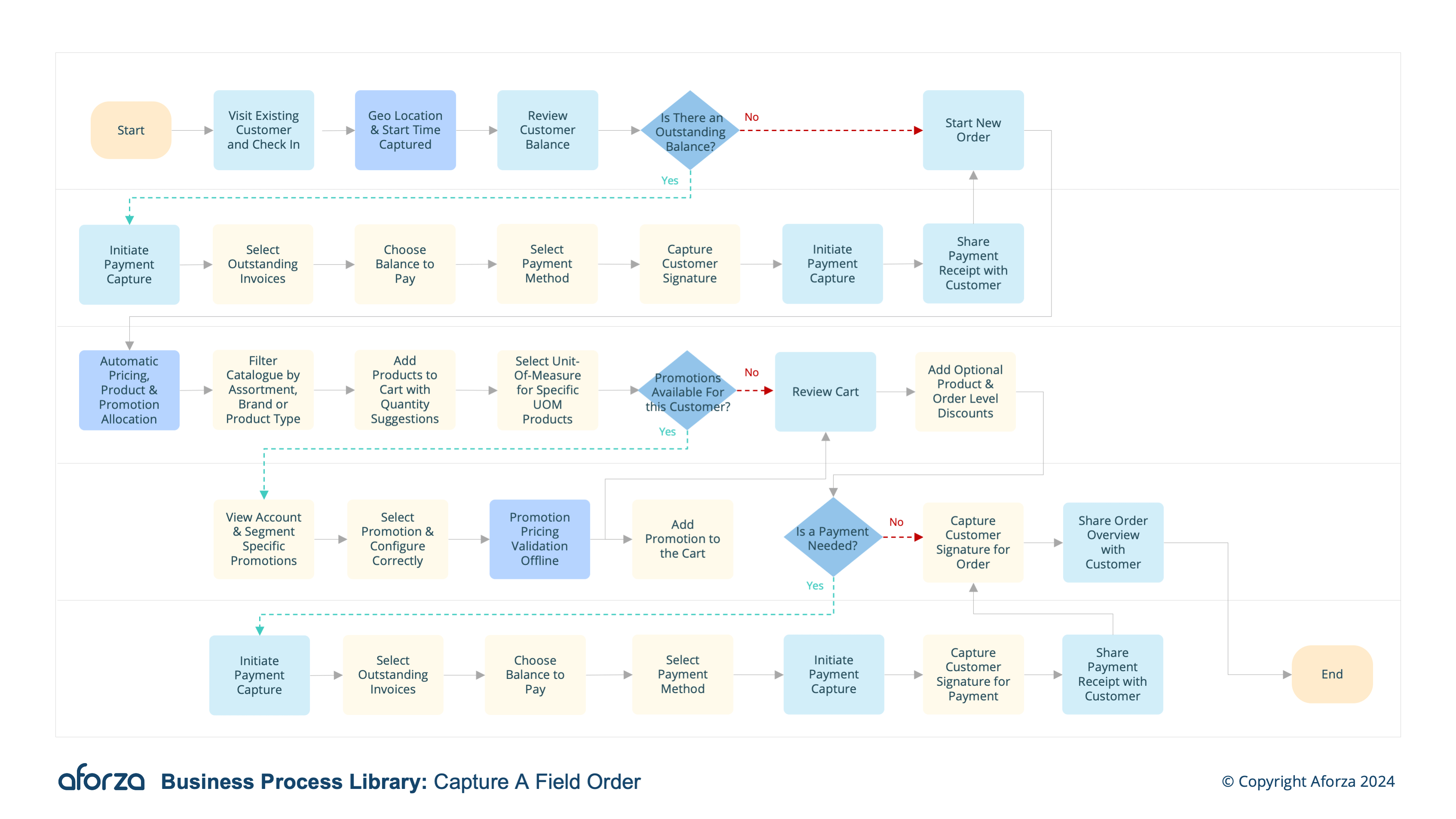 This process guides the field user through verifying their location, reviewing outstanding balances, starting a new order, adding promotions, and finalizing the order with suggested products. By incorporating customer-specific assortments, promotions, and recommended products, this process not only enhances order accuracy but also maximizes sales opportunities. The ability to take payments on-site further improves the efficiency and convenience of the transaction.