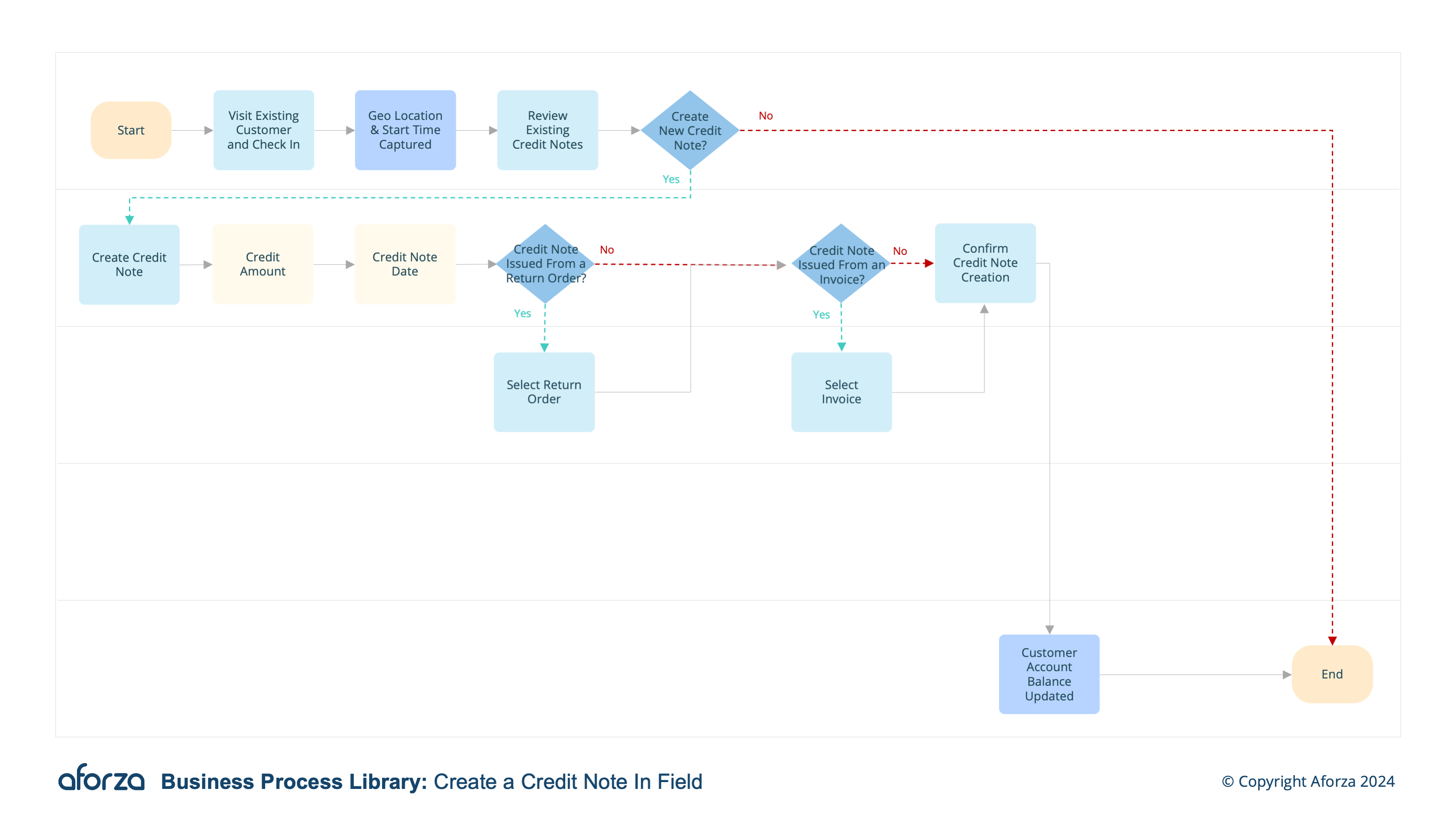 This process guides the field user through verifying their location, reviewing existing credit notes, creating a new credit note, linking it to relevant transactions, and updating the customer credit. By following these steps, field users can ensure precise record-keeping and prompt updates to customer accounts, thereby enhancing customer satisfaction and financial transparency.